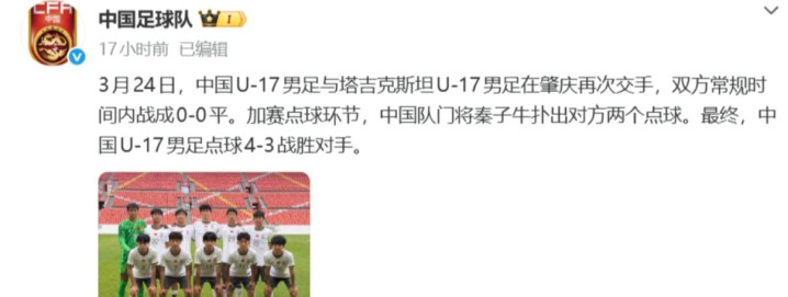 中国U17男足在热身赛中再创奇迹,点球大战以4-3力克塔吉克斯坦,豪取五连胜。一场荡气回肠的胜利,不仅宣告了青年军的强势崛起,更诞生了一位比肩李昊的超级门神,让中国足球的世界杯之梦重现曙光。